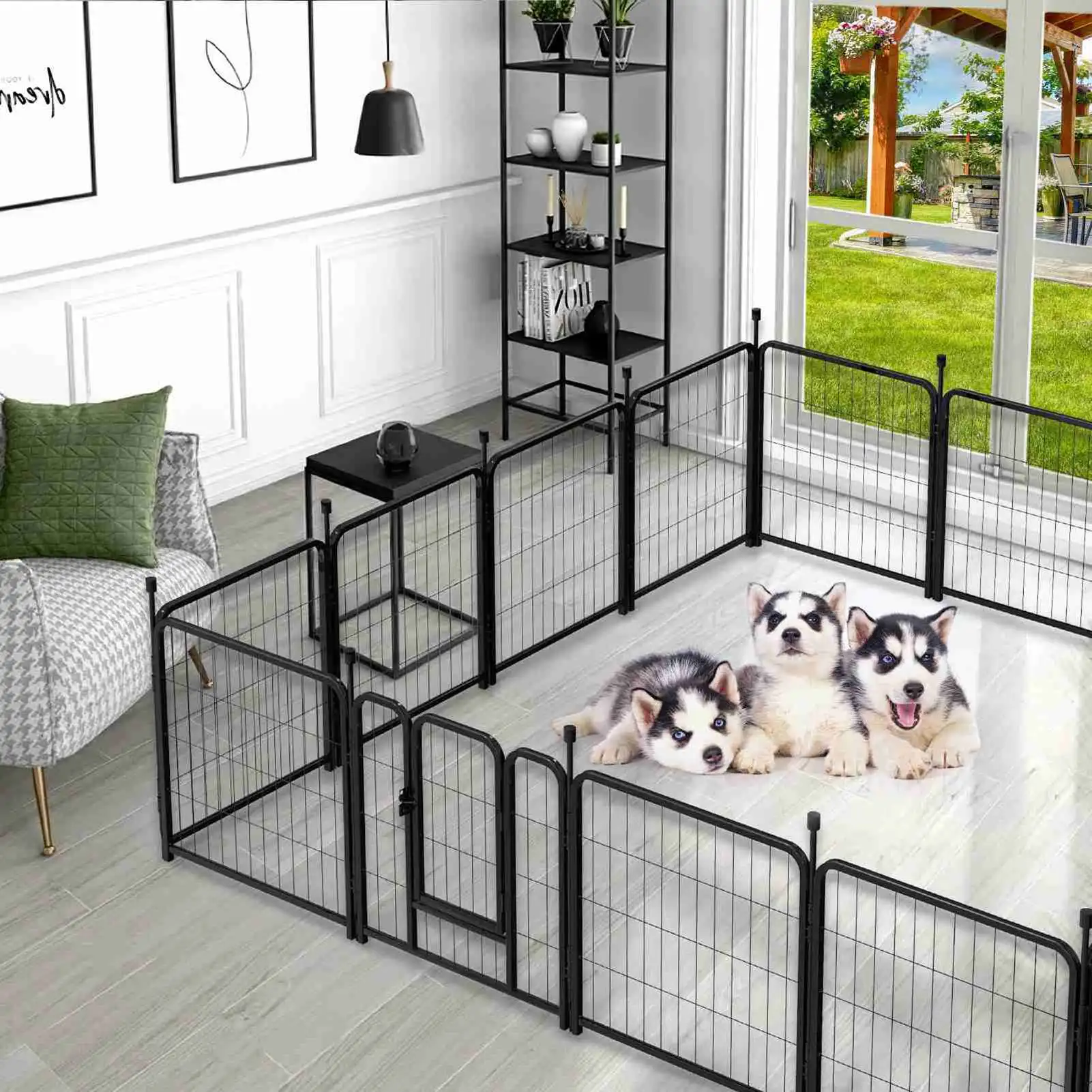 | Features | 1、Flexible Use: Each panel of this pet pen can easily form a large area and also can be divided into different shaped spaces for different needs. 2、Sturdy Material: Made of high strength metal material, this dog exercise playpen is sturdy and robust, resisting daily wear and tear, ensuring longevity and durability for indoor and outdoor use. 3、Open Top Design: This metal pet fence creates an open top enclosed area for pets to play and exercise, enhancing ventilation and a wider vision for your pet. 4、Enhanced Safety: Each panel is high enough to prevent the dog from jumping out of the fence, ensuring the security of your pet while playing. 5、Portable and Foldable: When playtime is over, the heavy duty dog playpen folds flat for compact storage and portability, easy for transportation. |