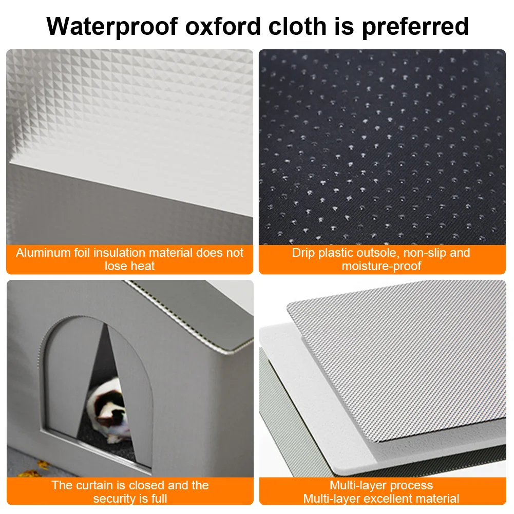 Features: 1. Outdoor Shelter for Cats: Our outdoor cat house is an ideal home for outdoor cats, community cats, and feral cats. Designed with warmth and comfort in mind, it offers a cozy retreat for pets in garages, porches, barns, balconies, and other locations. 2.Insulated Weatherproof Design: This feral cat shelter features a dual-sided mat design, with one side being plush for warmth and the other featuring aluminum foil for heat retention. The fully enclosed insulation box ensures your feline friend stays protected and comfortable in cold weather. 3.Rainproof and Moisture Resistant: Our stray cat shelter is made from high-quality waterproof materials to keep cats dry even in heavy rain. The integrated sloped roof prevents water accumulation, providing a safe haven for your beloved pet in any weather. 4.Quick Setup and Easy Assembly: Our feral cat house is easy to assemble, allowing you to provide shelter for your cat immediately. Its lightweight design makes it easy to move the house for outdoor cats as needed. 5.Space-Saving Size: The stray cat condo measures approximately 42x42x42cm, suitable for cats weighing no more than 10kg/22lbs. Choose the right outdoor cat house for your pet's comfort. Specification: Origin: Mainland China Product size: 42x42x42cm Material: Oxford cloth/sponge layer/aluminum foil insulation lining Applicable: Suitable for cats/dogs Scope of application: Can carry four kittens; Suitable for pets under 10 kg/22 pounds Note: You need to assemble it yourself