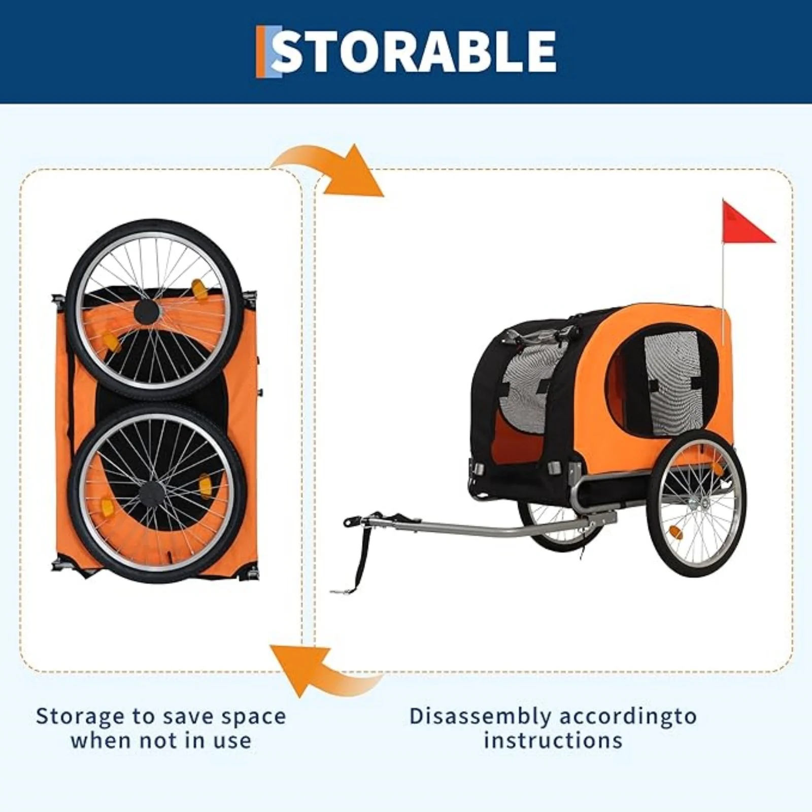 Quick-Fold Design for Easy Storage & Transport 🏡✨ Takes less space than a suitcase! The trailer folds down effortlessly to 24"x8"x32" using smooth-hinge mechanisms—no tools needed. Detach the wheels, fold the frame, and store it in your car trunk or closet. Perfect for pet owners with limited storage space.